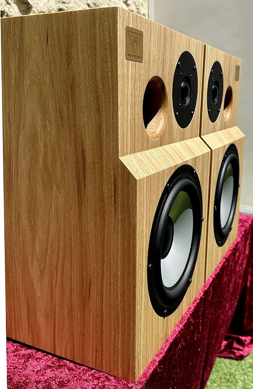 Enceinte audiophile 2 voies bass-reflex au format bibliothèque, de conception symétrique.